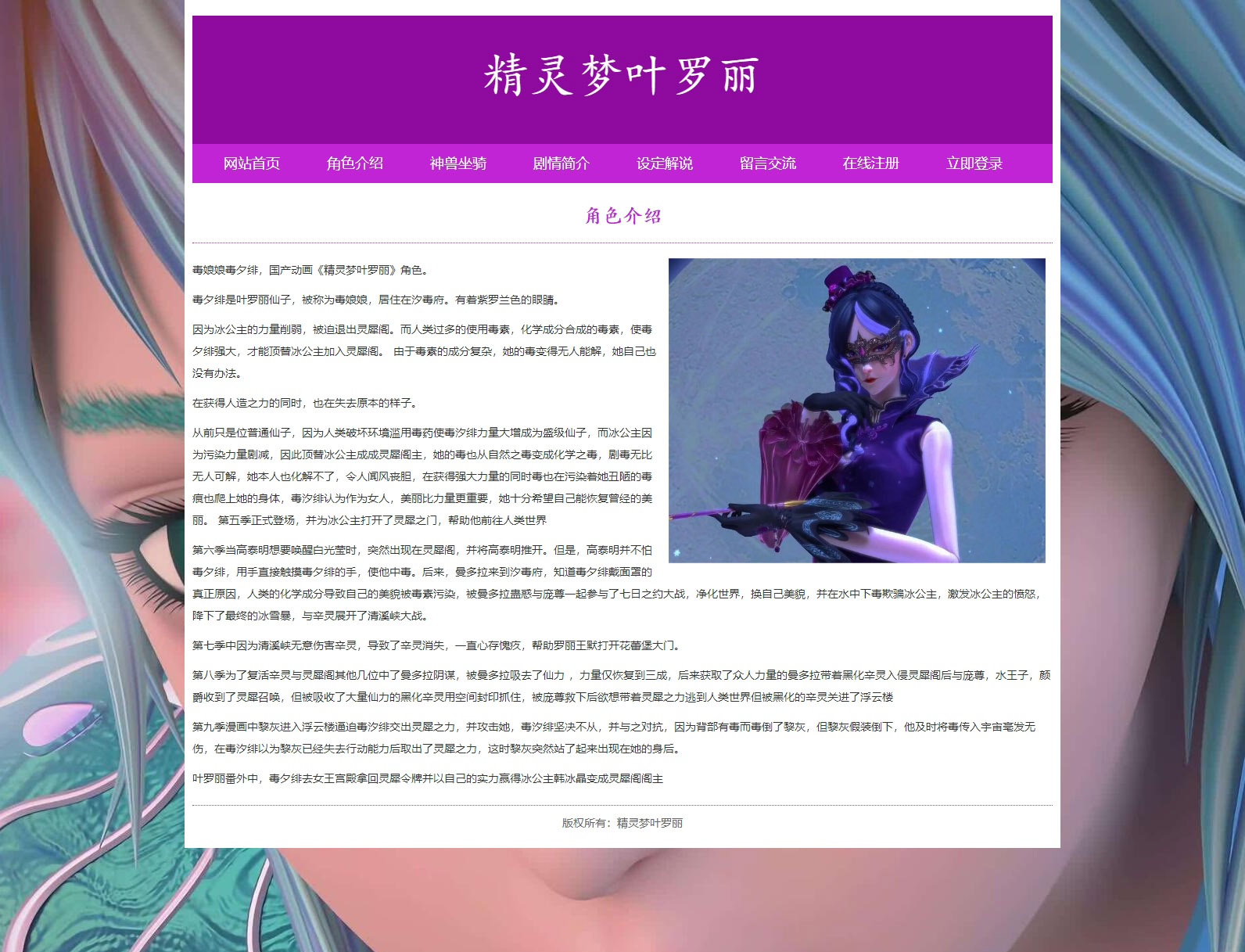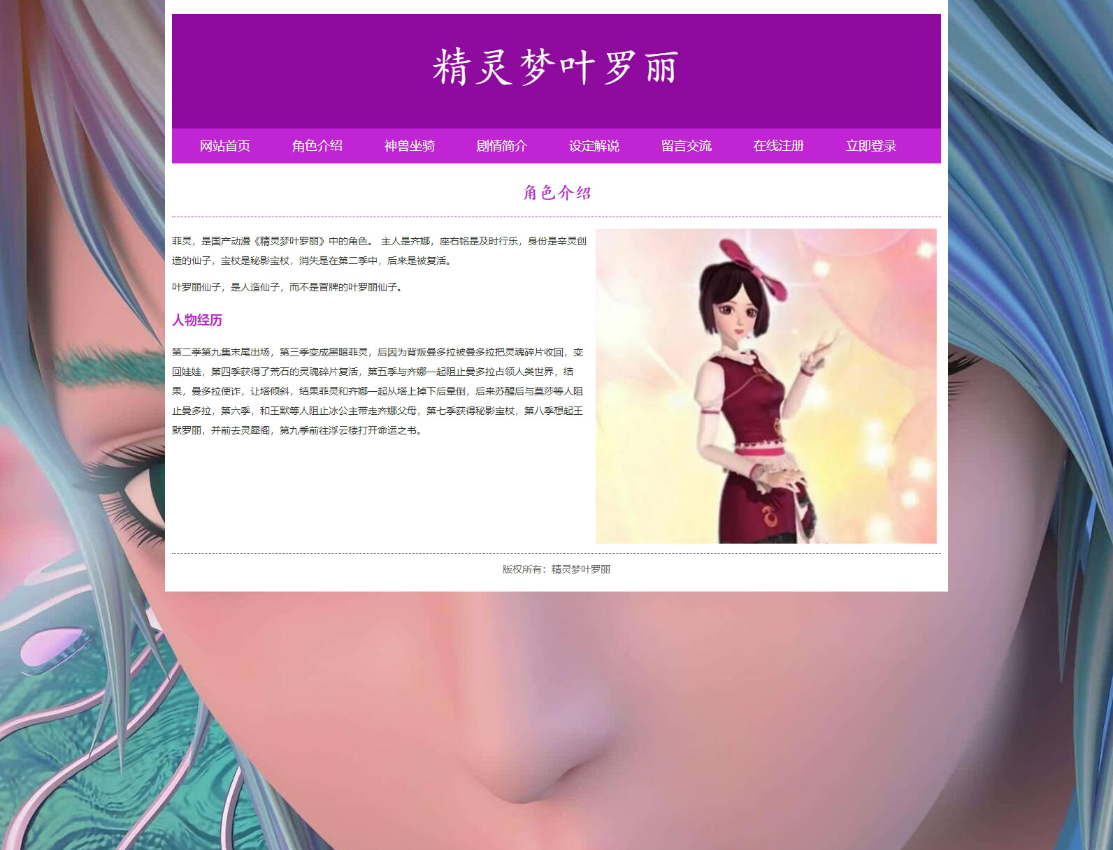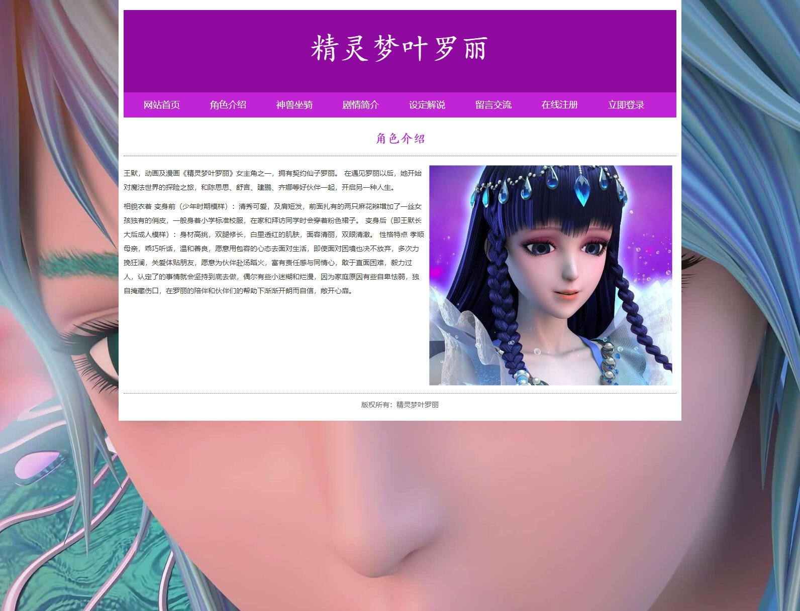 精灵梦叶罗丽 32页面 国产3D动画 冒险 魔法少女 童话动画片 HTML5 带设计说明 JS轮播特效 注册登录留言表单(0/0)