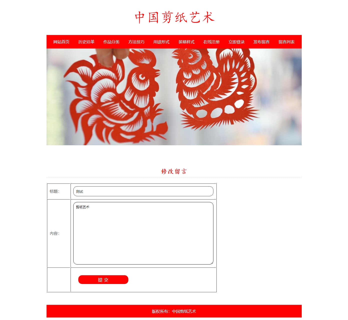 中国剪纸艺术 12页面 民间工艺主题 中华优秀传统文化 HTML5 带设计说明 ASP+ACCESS数据库 注册登录留言功能 搜索修改删除留言功能(增删查改(0/0)