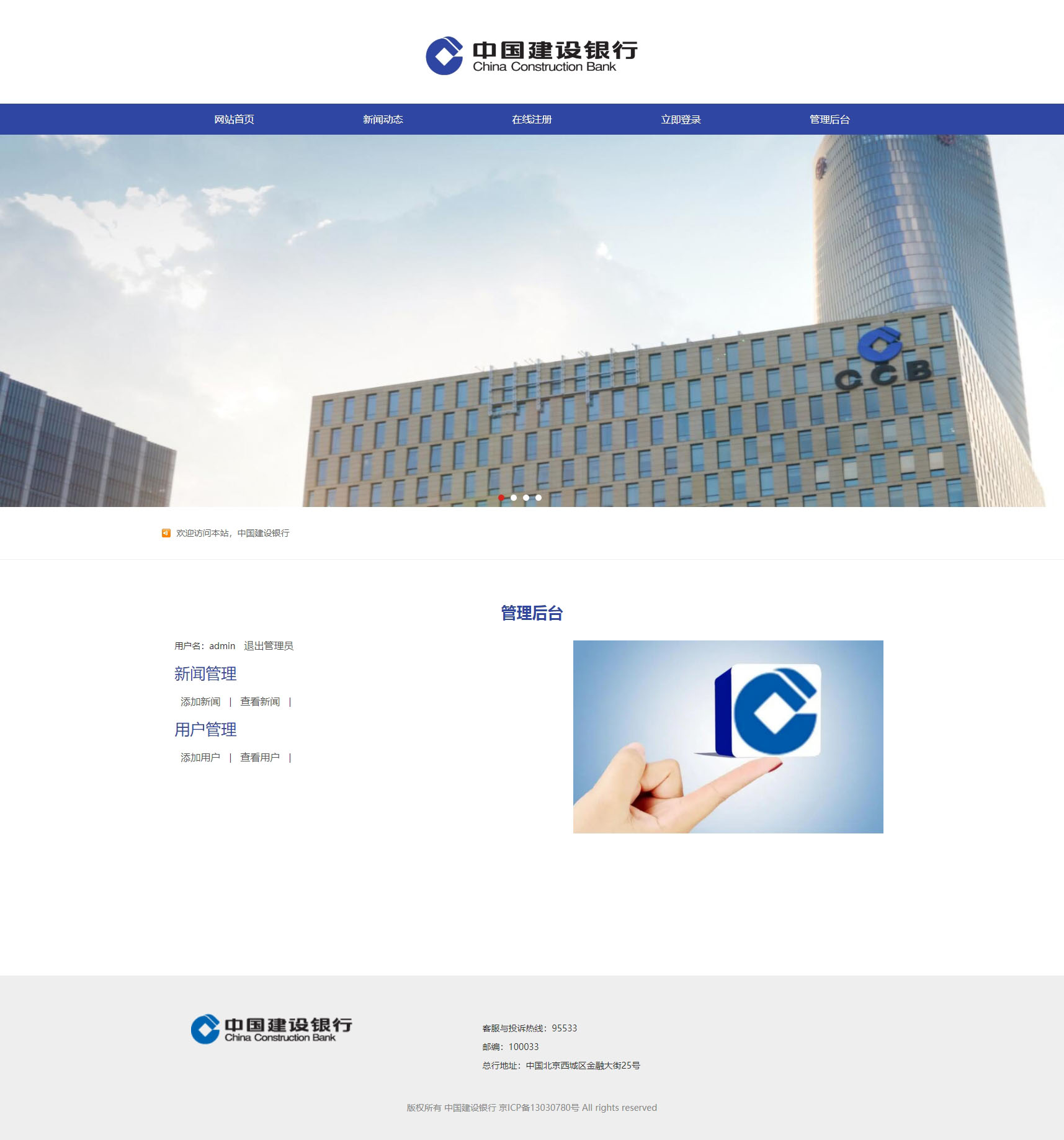 中国建设银行 12页面 金融基金投行 世界五百强 带设计说明 轮播特效 TAB切换 PHP+MYSQL数据库 后台管理系统 注册登录 权限管理 用户管理 添加修改用户 新闻管理 添加修改删除新闻 增删查改(0/0)