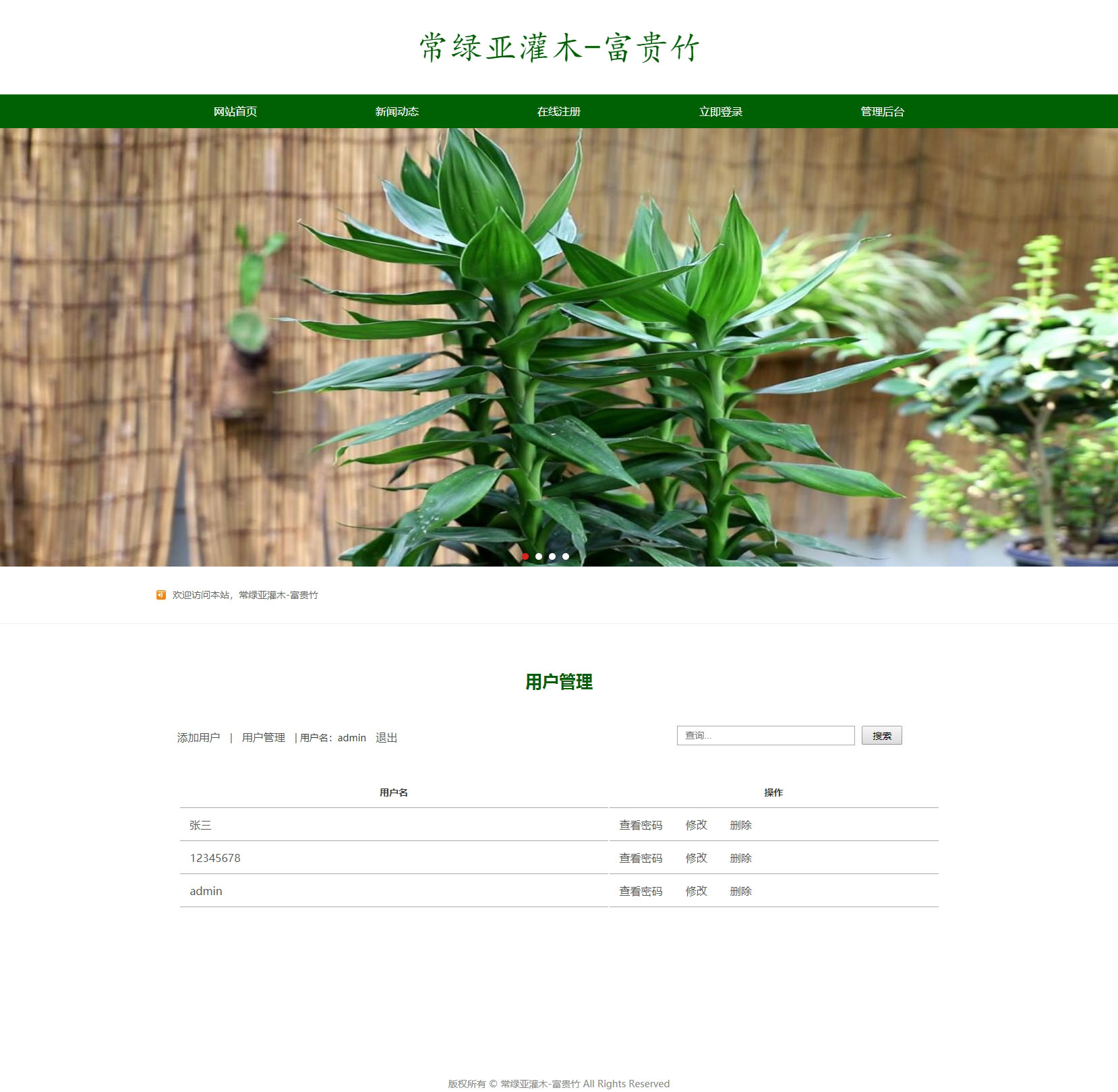 常绿亚灌木-富贵竹 12页面 绿植 植物花卉科普 带jquery图片轮播特效 PHP+MYSQL数据库 后台管理系统 注册登录 权限管理 用户管理 添加修改用户 新闻管理 添加修改删除新闻 增删查改(0/0)