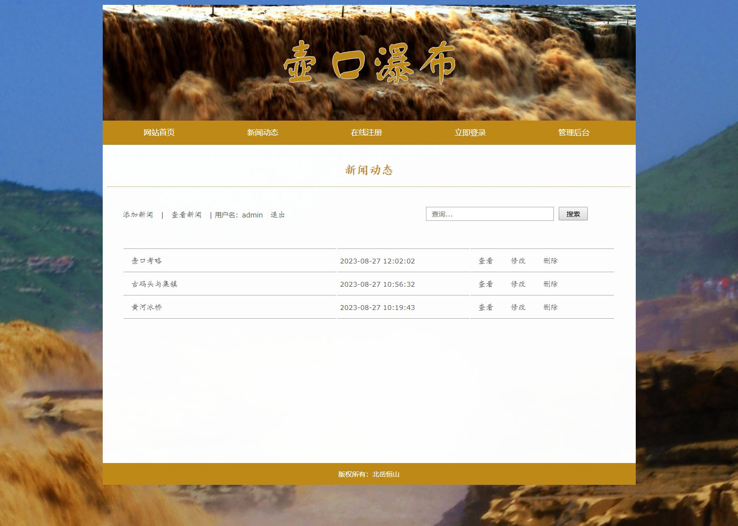 壶口瀑布 11页 旅游景点 中国第二大瀑布 HTML5 带设计说明 JS轮播特效 PHP+MYSQL数据库 后台管理系统 注册登录 权限管理 用户管理 添加修改用户 新闻管理 添加修改删除新闻 增删查改(0/0)