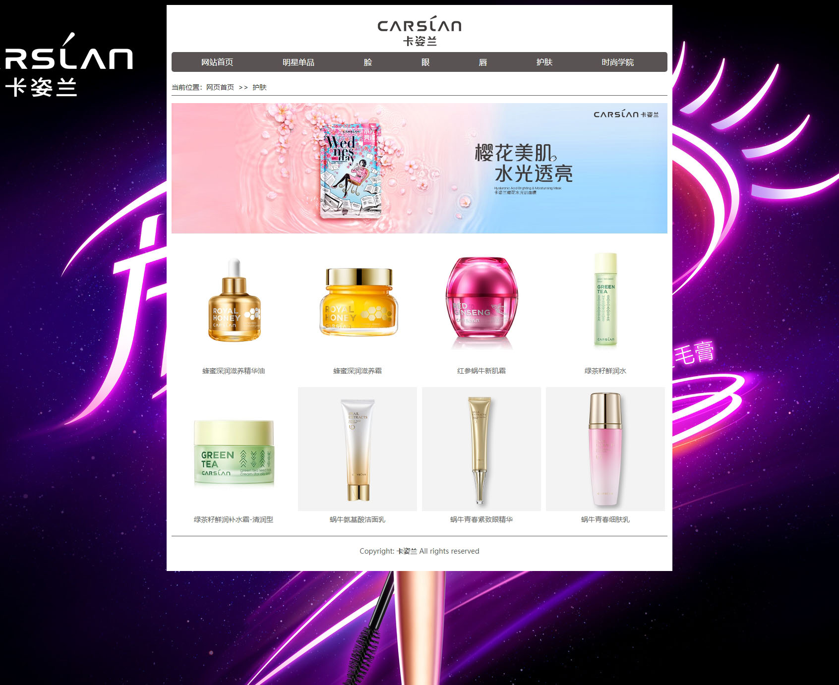 卡姿兰 32页面 美妆彩妆护肤化妆品企业电商官网 带设计说明 JS轮播特效 本地视频 三级详情页面 四级购物车页面(0/0)