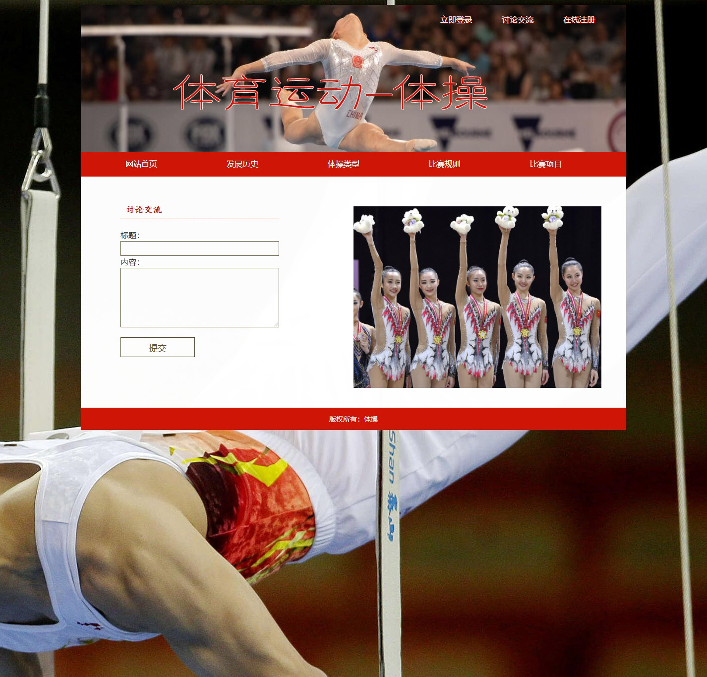 体育运动-体操 13页面 HTML5 带背景音乐 JS图片轮播特效 下拉菜单 三级页面 ASP+ACCESS数据库 注册登录留言功能 搜索修改删除留言功能(增删查改)(0/0)