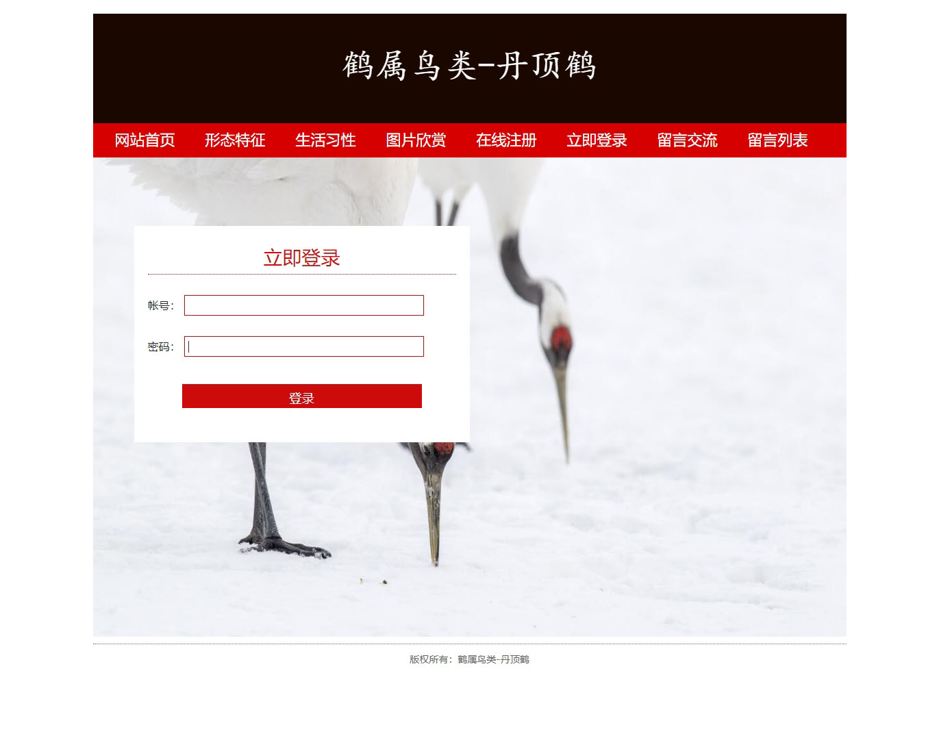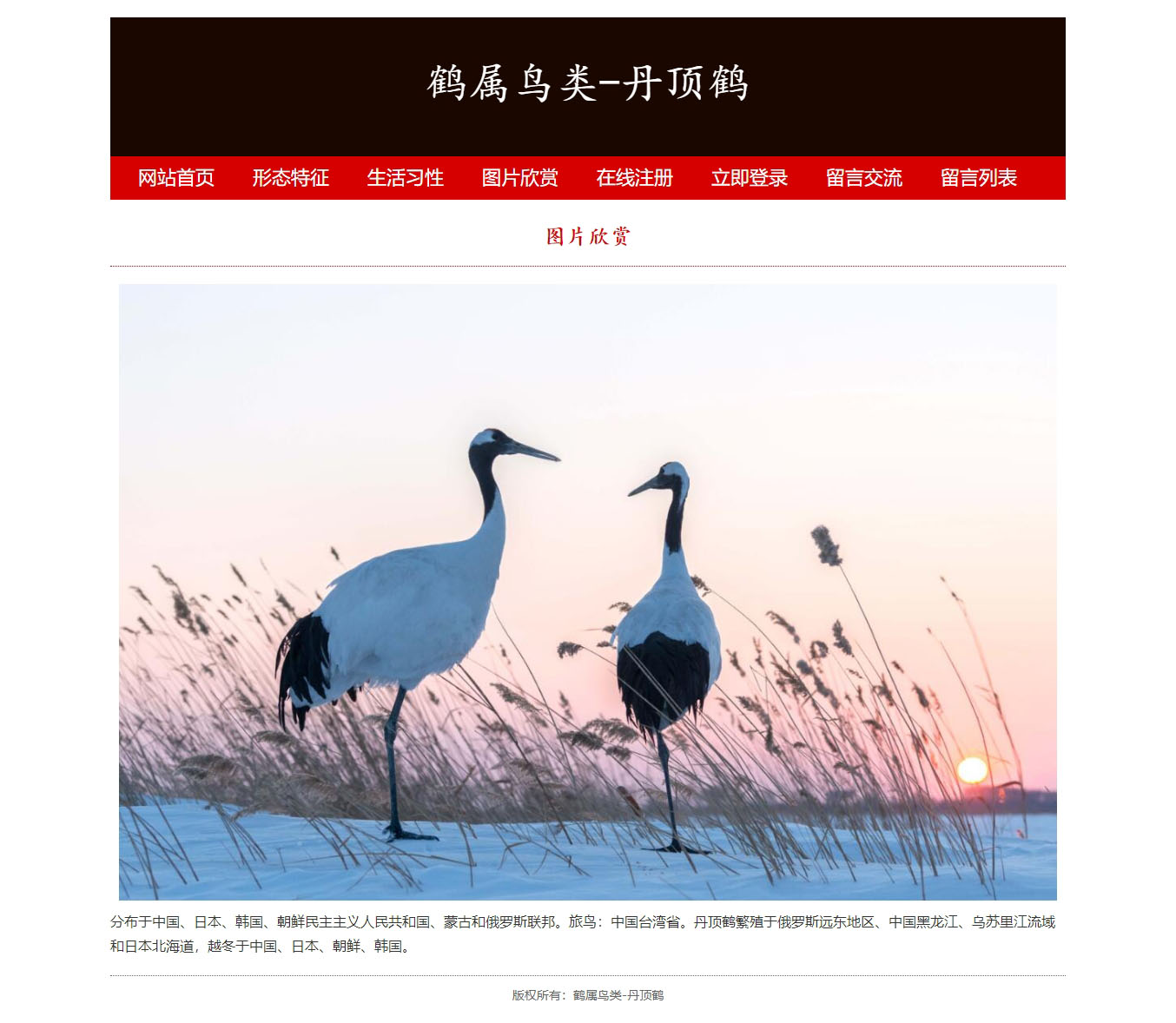 鹤属鸟类-丹顶鹤 16页面 仙鹤 红冠鹤 濒危物种 国家重点保护野生动物 HTML5 带JS图片轮播特效 ASP+ACCESS数据库 注册登录留言功能 搜索修改删除留言功能(增删查改)(8页面版本90元 ) (0/0)