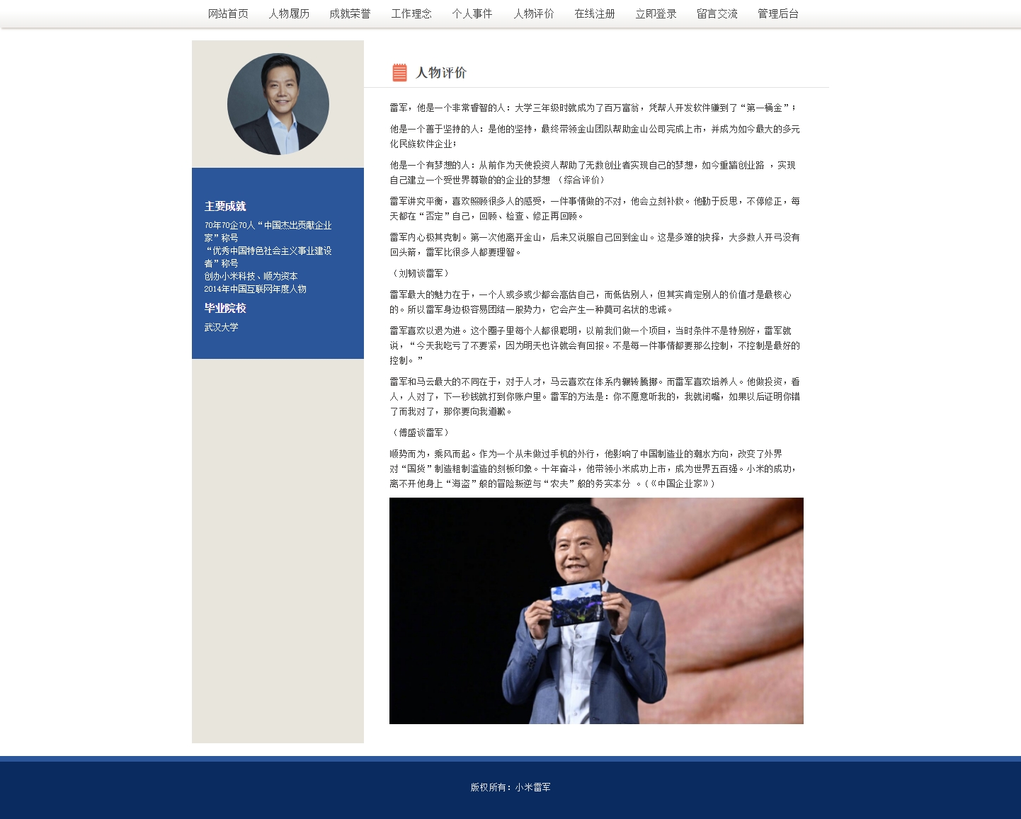 小米雷军 15页面 天使投资人 中国互联网代表人物 HTML5 带设计说明 ASP+access数据库 注册登录留言功能 用户权限管理 管理员 用户管理 留言管理 搜索查看修改删除功能(增删查改)(0/0)