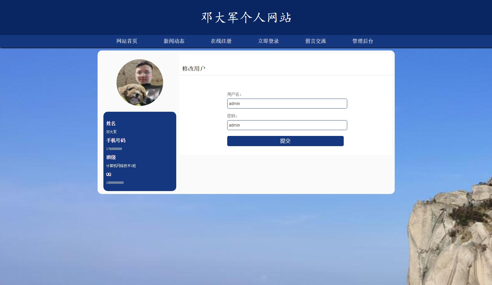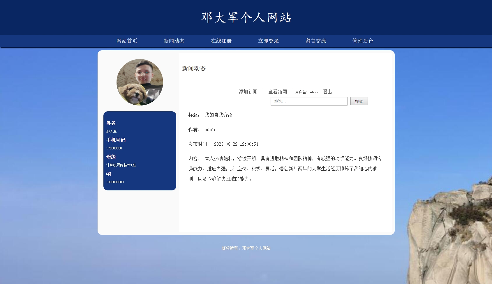 邓大军个人网站 16页 个人博客 HTML5 带设计说明 JS图片轮播特效 PHP+MYSQL数据库 后台管理系统 注册登录留言 权限管理 用户管理 添加修改用户 新闻管理 添加修改删除新闻 留言管理(增删查改)(0/0)