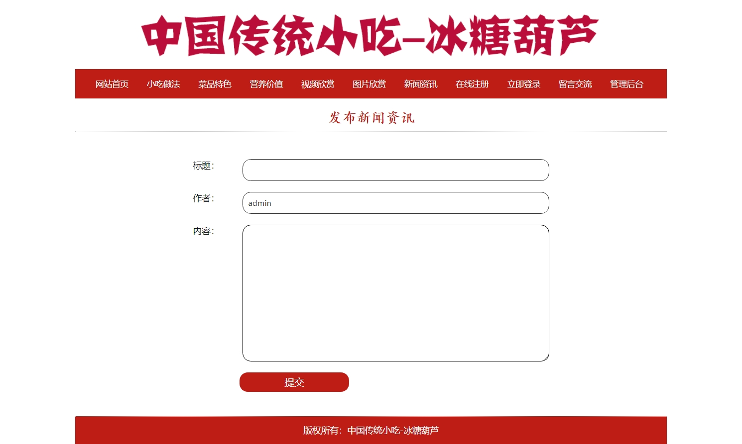 中国传统小吃-冰糖葫芦 美食特产 19页面 Html5 带设计说明 轮播特效 在线视频 ASP+ACCESS数据库 注册登录留言 新闻发布 用户权限管理 管理员 用户管理 留言管理 搜索查看修改删除功能 增删查改(0/0)