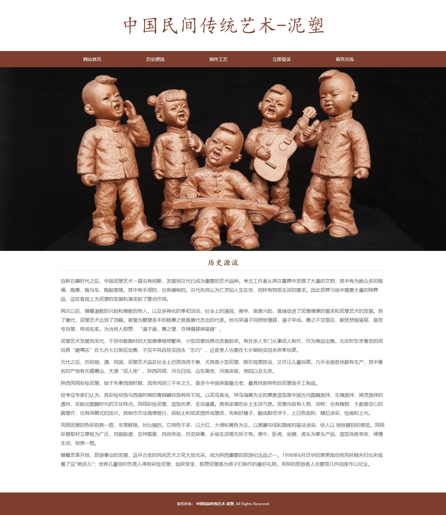 中国民间传统艺术-泥塑 5页面 HTML5 民间艺术 非物质文化遗产名录 排版简单 带设计说明 登录留言表单 表单验证(0/0)