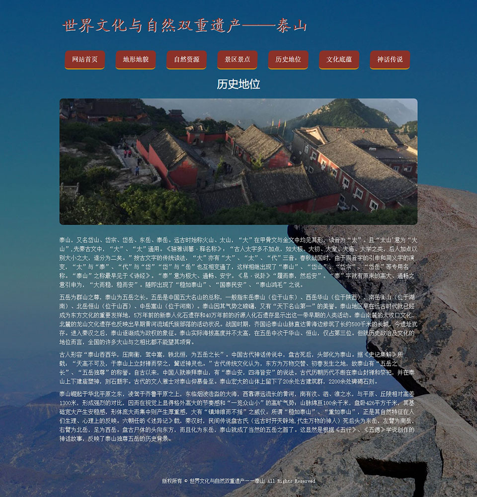 世界文化与自然双重遗产—泰山 7页面 (又名岱山、岱宗、岱岳、东岳、泰岳,为五岳之一)山东 旅游景点 html5+css3布局 带设计说明 JQuery图片轮播特效(0/0)
