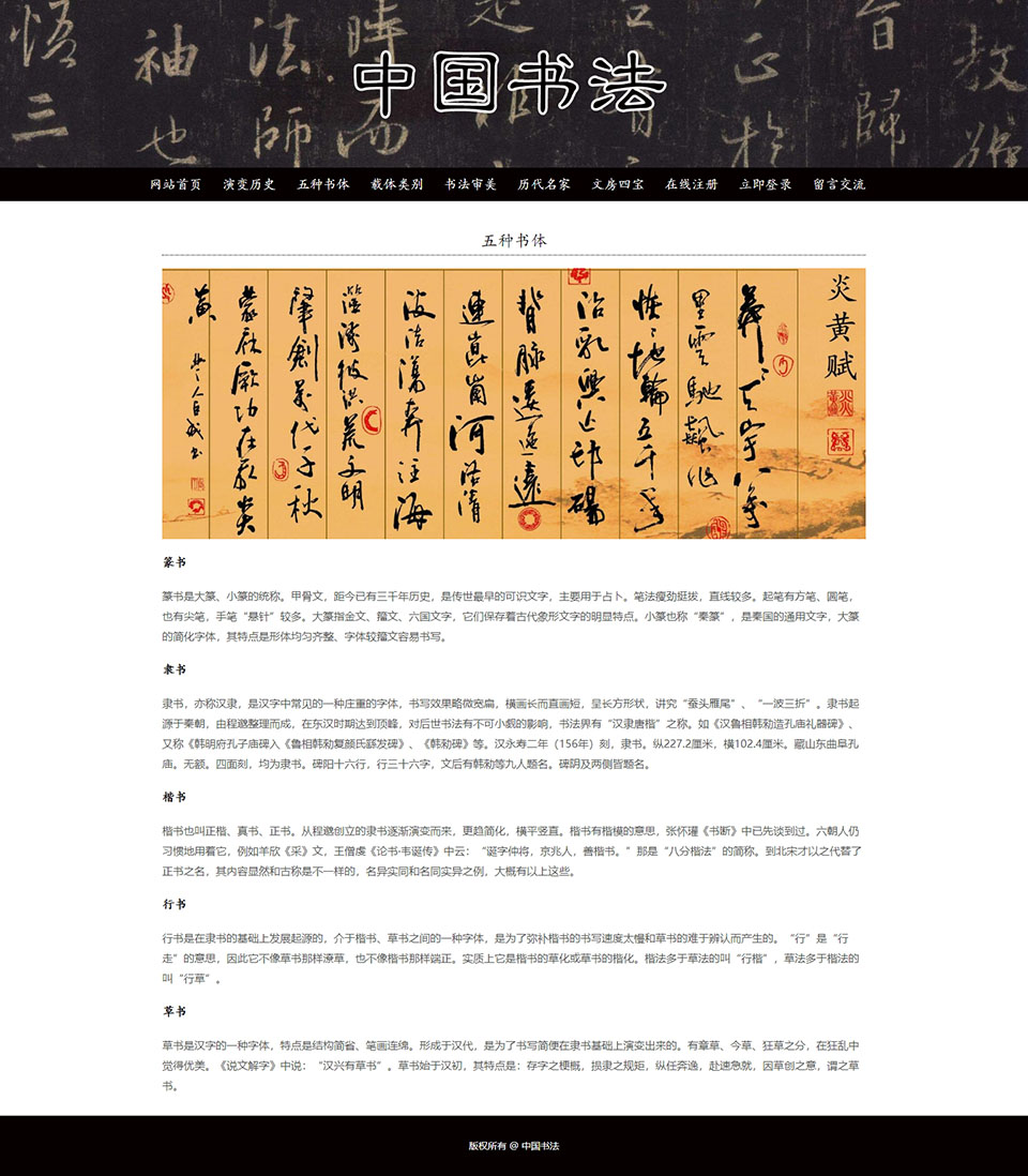 中国书法 10页面 中国文化传统艺术 带设计说明 jquery图片轮播特效 滚动文字 注册登录留言表单 时间代码(0/0)