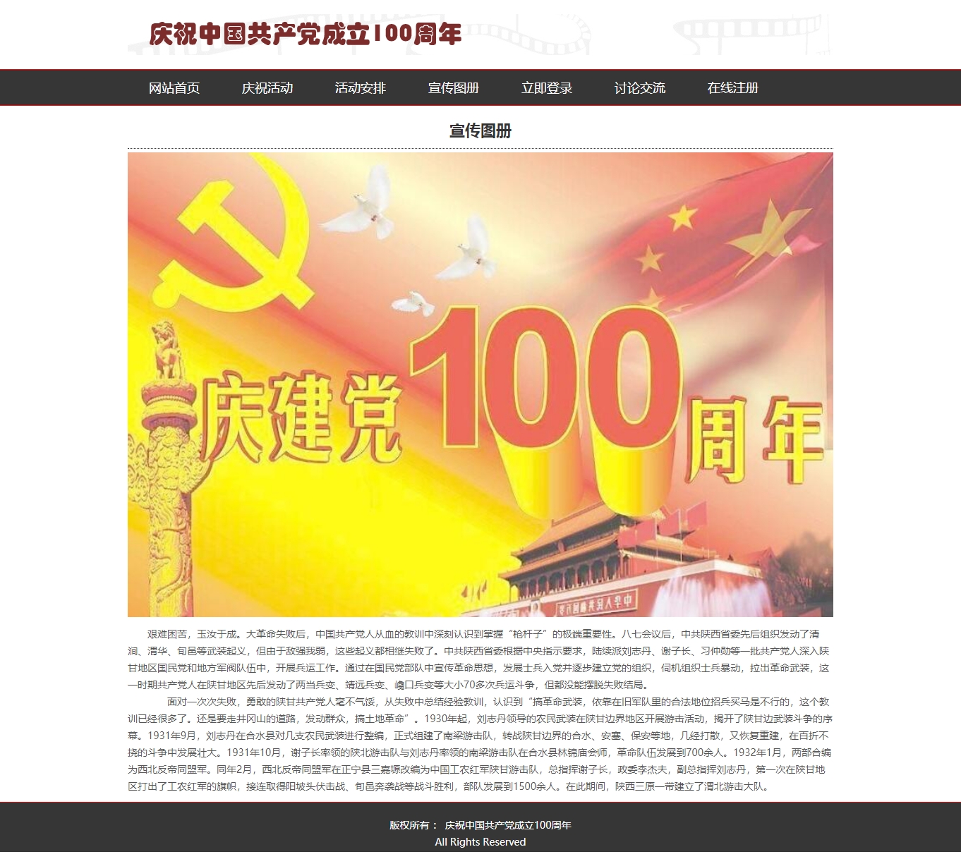 奋斗百年路 启航新征程 9页面 100周年建党 带JS图片轮播特效 注册表单