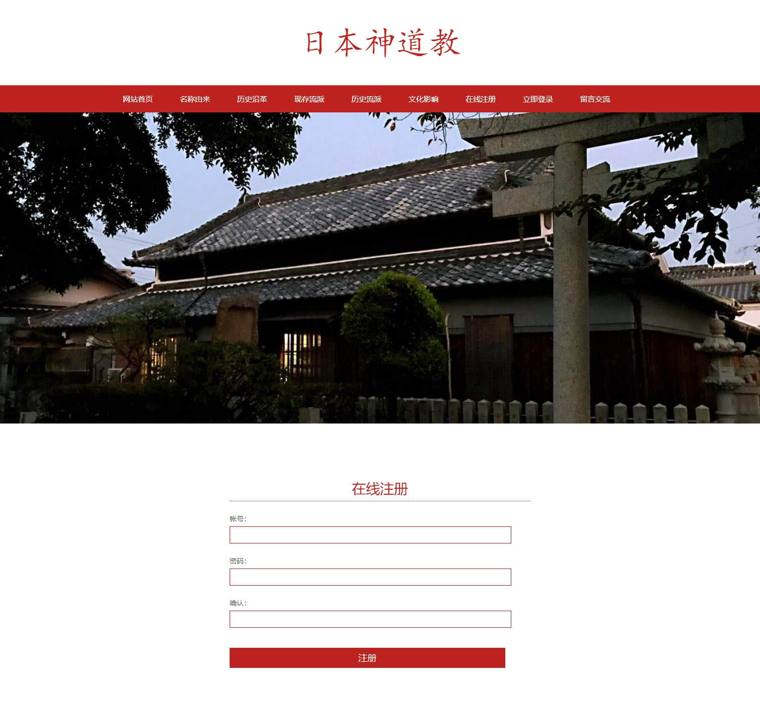 日本神道教 9页面 日本大和民族和琉球族的本土宗教 HTML5 带jquery轮播特效 注册登录留言表单 表单验证(0/0)