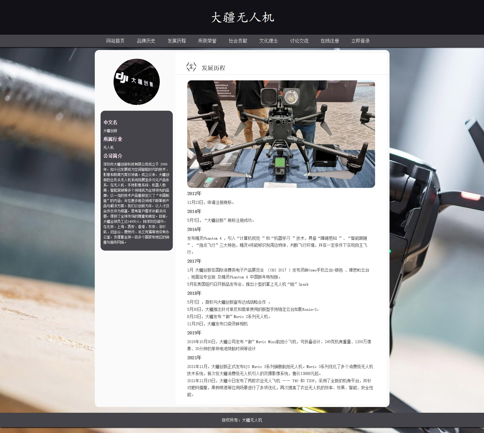 大疆无人机 9页面 大疆创新科技有限公司旗下无人机品牌 HTML5 带设计说明 JS图片轮播特效 注册登录留言表单 JS表单验证(0/0)