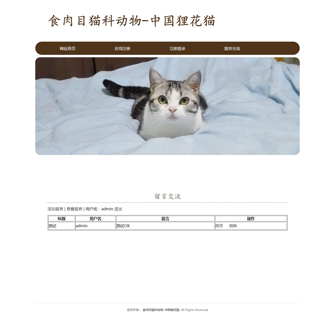食肉目猫科动物-中国狸花猫 5页面 自然猫 宠物猫 HTML5+CSS3布局 带设计说明 动态php+mysql 注册登录留言功能 admin管理员修改删除功能 表单验证(0/0)
