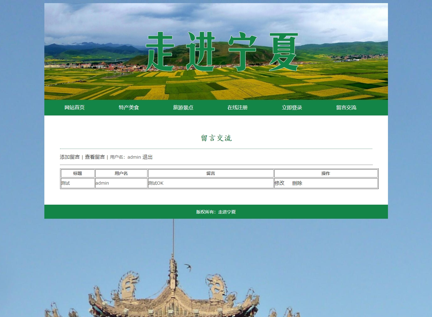 走进宁夏 8页面 家乡旅游主题 HTML5 带设计说明 背景音乐 JS图片轮播特效 动态php+mysql数据库 注册登录留言功能 admin管理员修改删除功能(0/0)