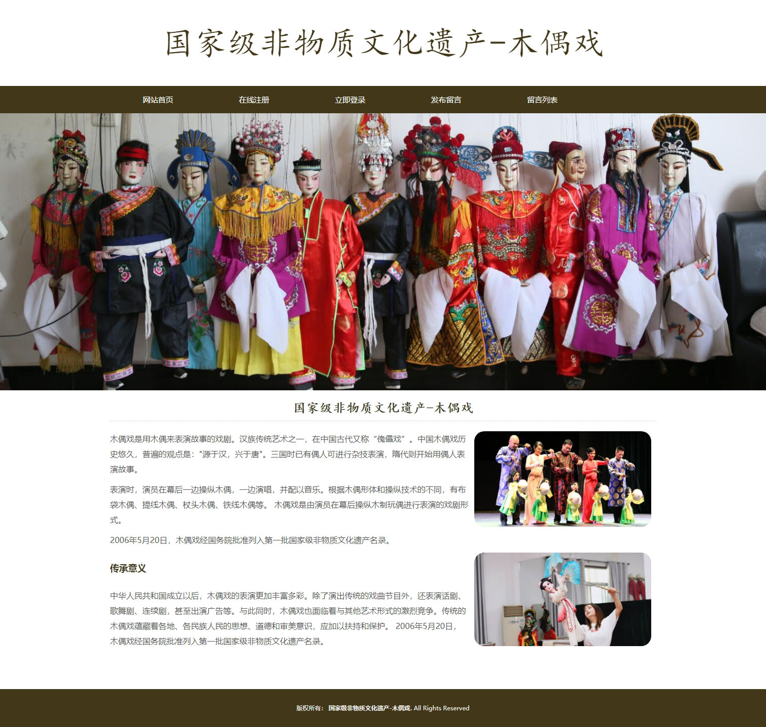 国家级非物质文化遗产-木偶戏 5页面 戏剧 傀儡戏 木偶艺术 HTML5 带设计说明 ASP+ACCESS数据库 注册登录留言功能 搜索修改删除留言功能(增删查改)(0/0)