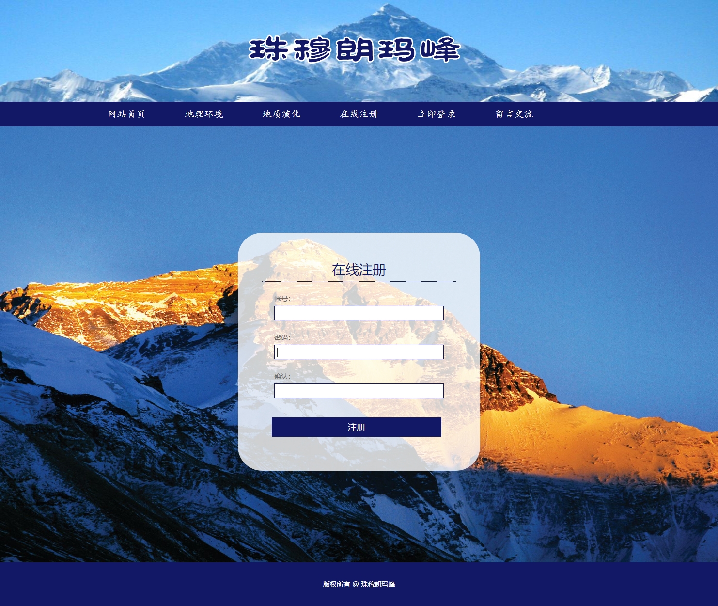 珠穆朗玛峰 7页面 西藏珠峰旅游景点介绍 带设计说明 jquery图片轮播特效 滚动文字asp+access数据库注册登录留言功能 (0/0)