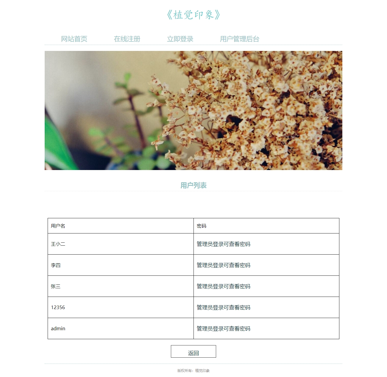 《植觉印象》 6页面 花卉 干花主题 带设计说明 js轮播特效 ASP+ACCESS数据库 注册登录功能 用户权限管理 admin管理员修改用户信息功能(0/0)