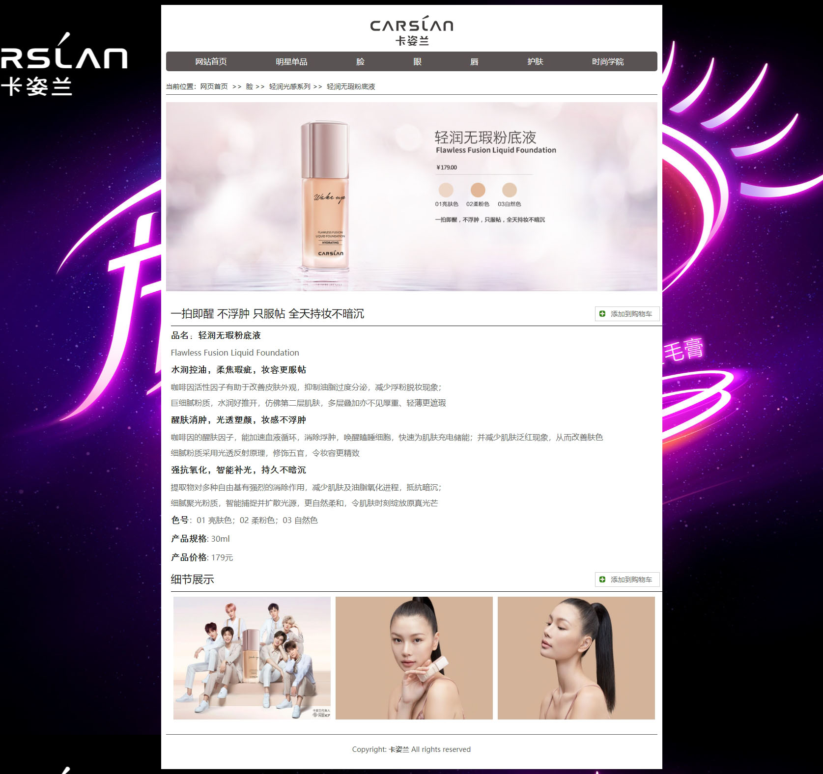卡姿兰 20页面 美妆彩妆护肤化妆品企业电商官网 带设计说明 JS轮播特效 本地视频 三级详情页面 四级购物车页面(0/0)