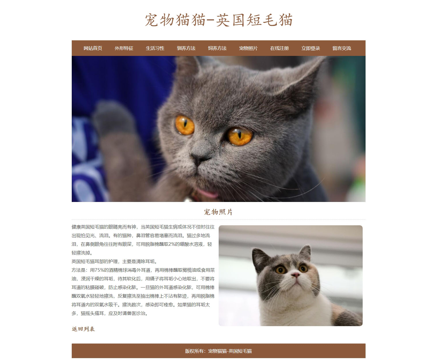宠物猫猫-英国短毛猫 20页面 HTML5 动物宠物主题 带设计说明 JS轮播特效 注册登录留言表单 JS表单验证(0/0)