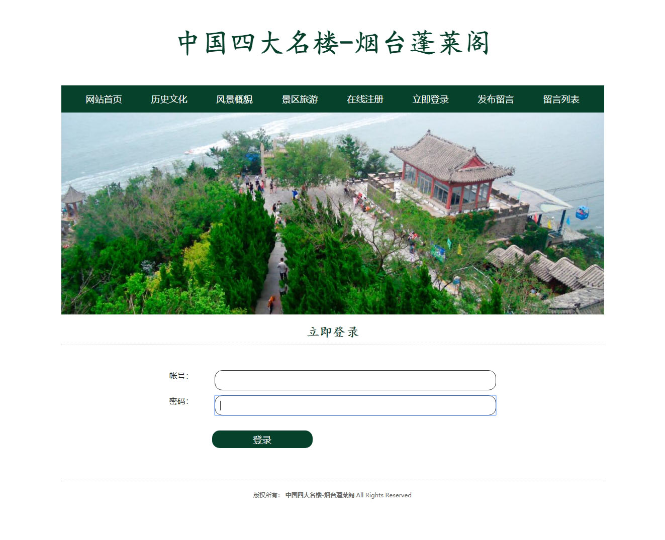 中国四大名楼-烟台蓬莱阁 8页面 山东烟台一处古建群 5A级旅游景区 HTML5+CSS3布局 带设计说明 ASP+ACCESS数据库 注册登录留言功能 搜索修改删除留言功能(增删查改)(0/0)