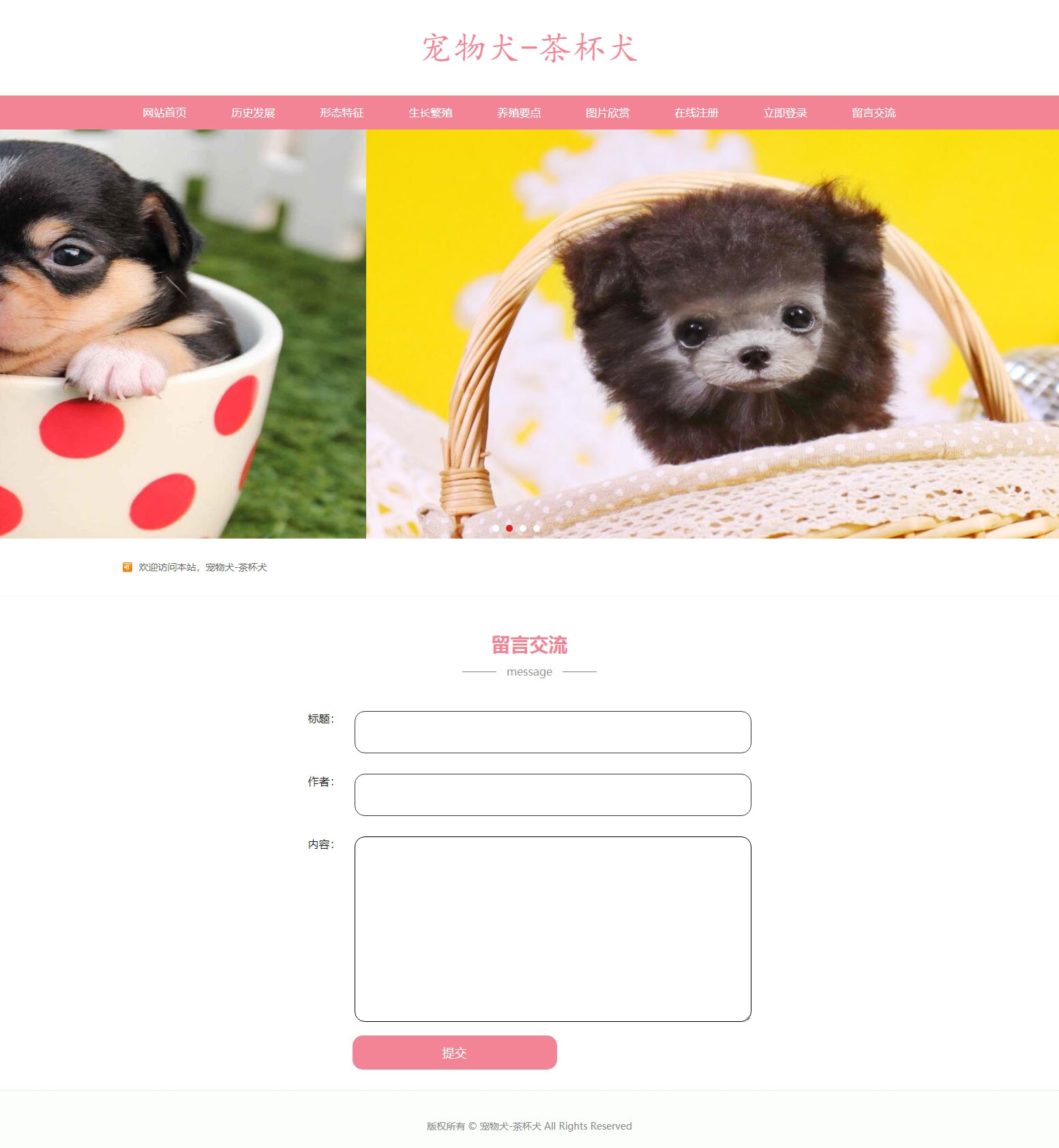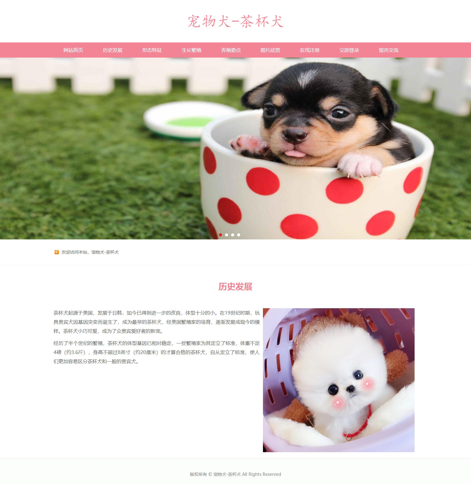 宠物犬-茶杯犬 25页面 犬科哺乳动物 世界上最小的犬种 宠物狗狗 带设计说明 jquery图片轮播特效 注册登录留言表单 JS表单验证(0/0)