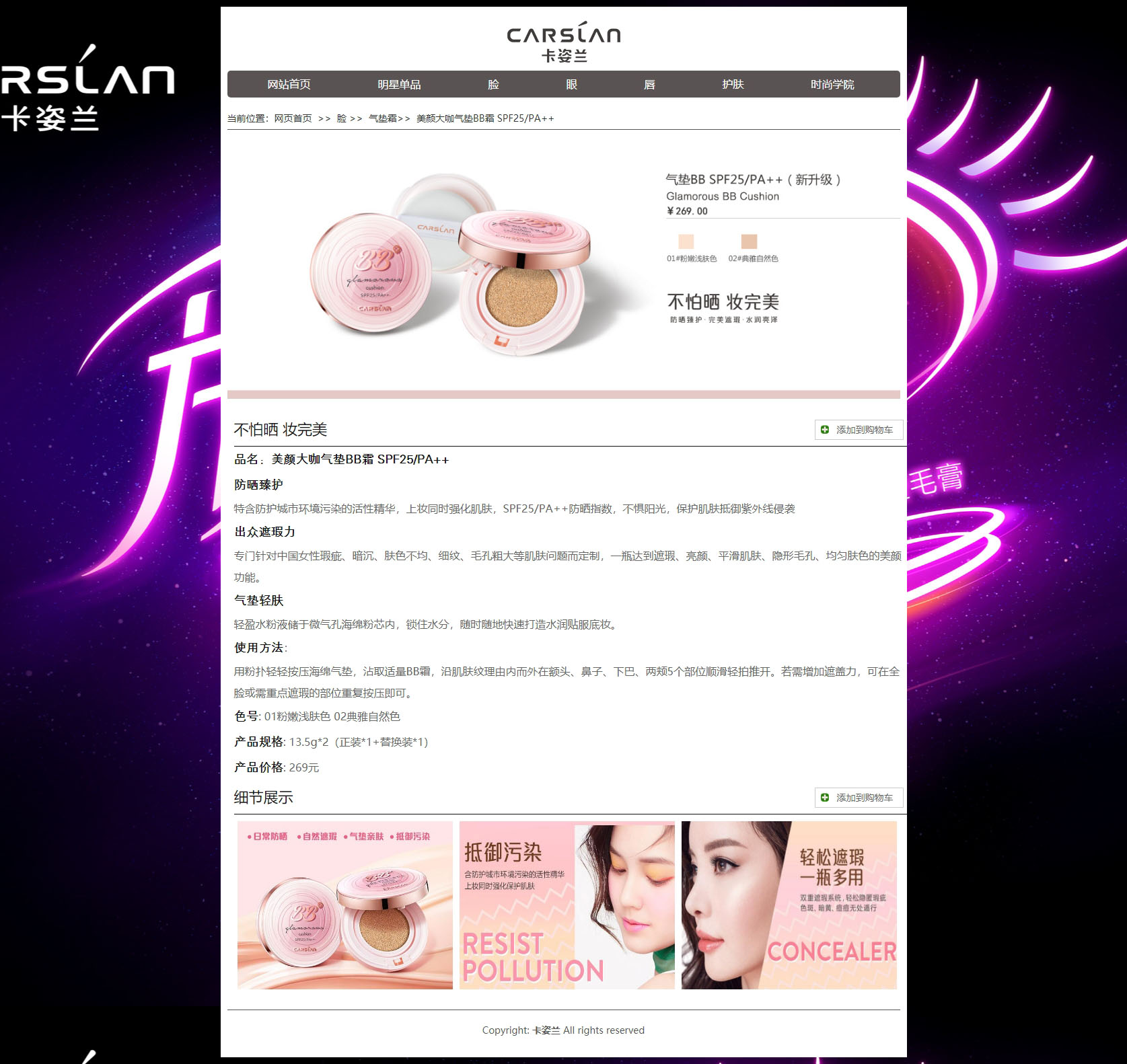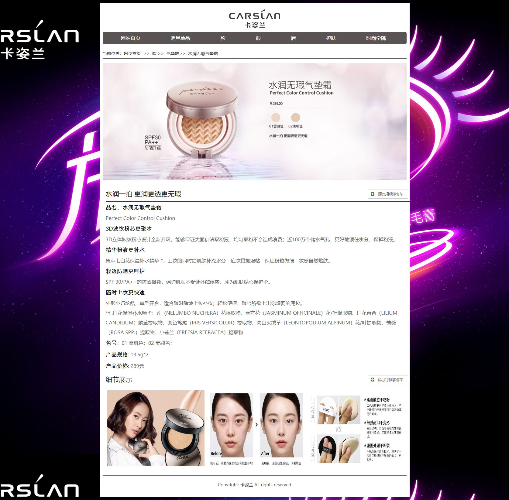 卡姿兰 24页面 美妆彩妆护肤化妆品企业电商官网 带设计说明 JS轮播特效 本地视频 三级详情页面 四级购物车页面(0/0)