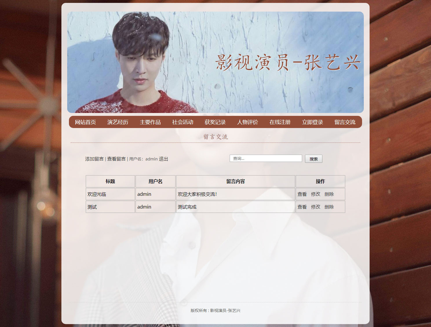影视演员-张艺兴 10页面 明星主题 HTML5+CSS3布局 带设计说明 JS轮播特效 滚动文字 php+mysql数据库 注册登录留言功能 管理员查看搜索修改删除功能(增删查改)(0/0)