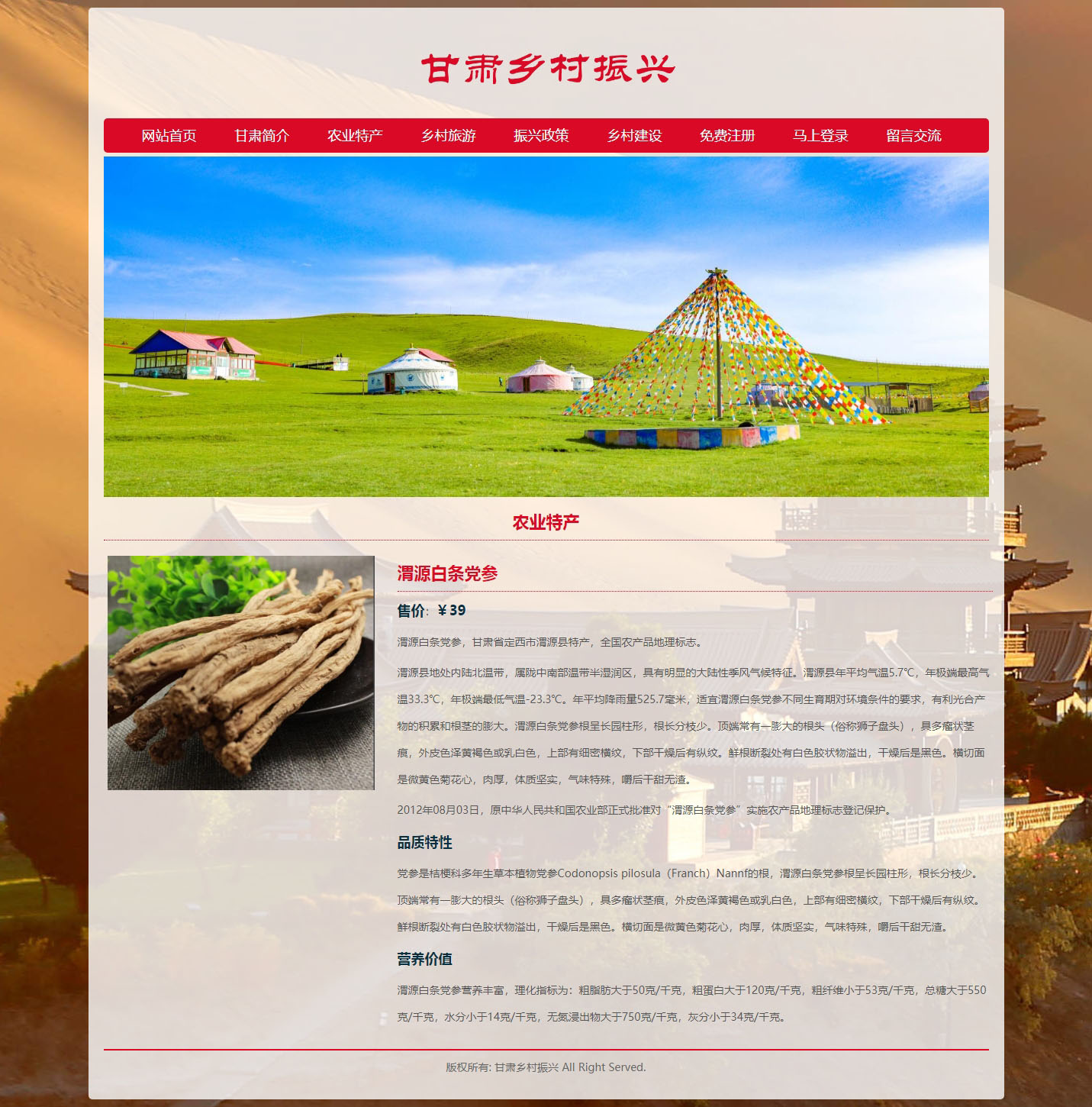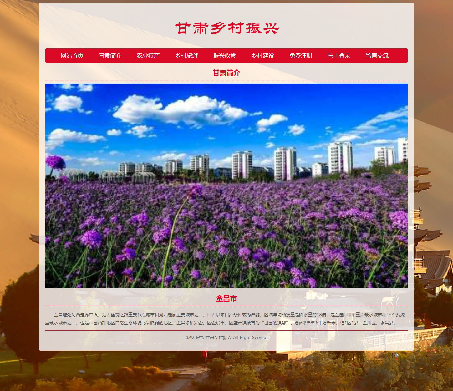 甘肃乡村振兴 30页面 家乡旅游美食特产介绍 建设家乡 带设计说明 本地视频 JS轮播特效 注册登录留言表单 JS表单验证(0/0)