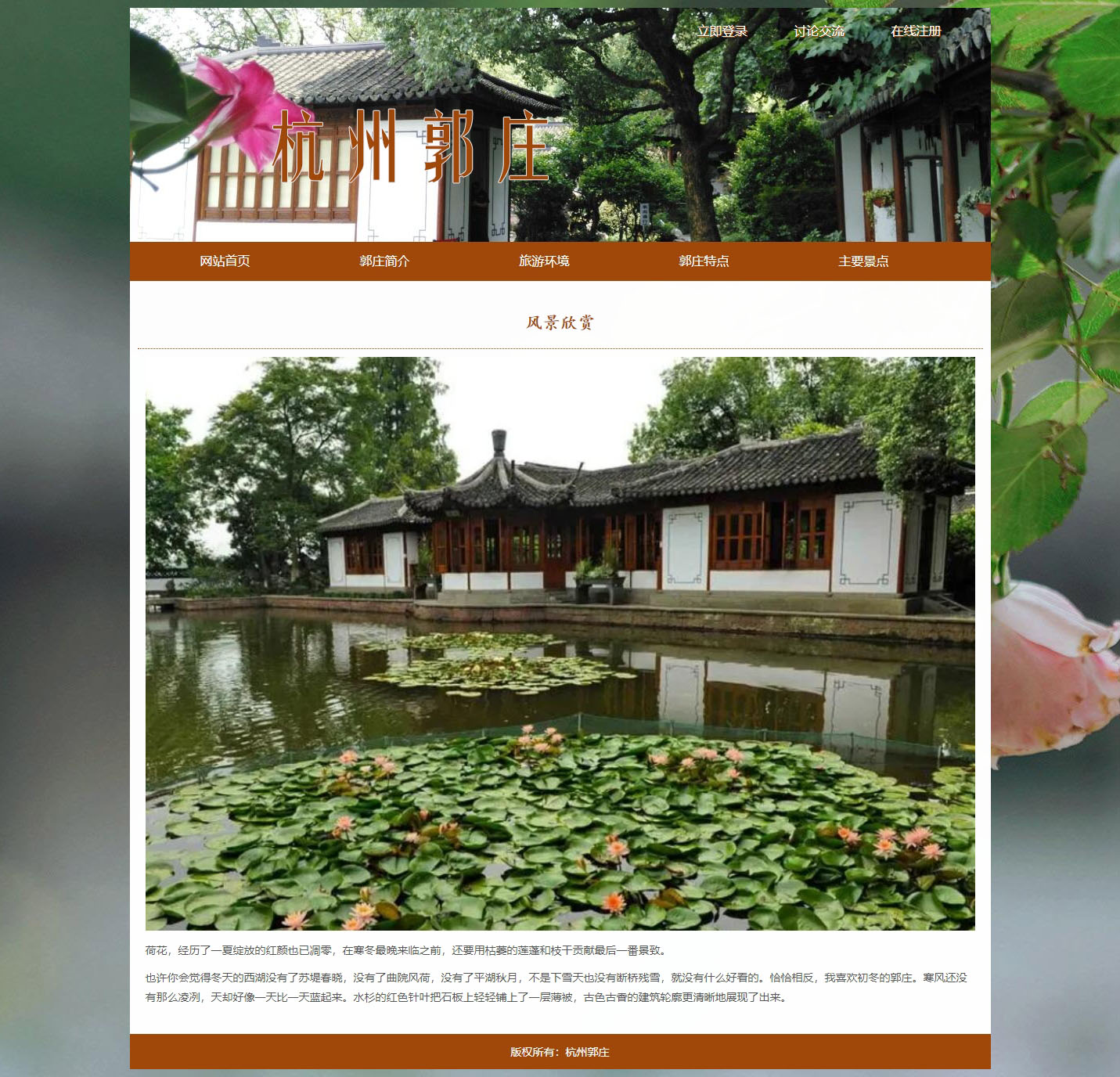 杭州郭庄 30页面 旅游景点园林主题 HTML5 带设计说明 背景音乐 JS图片轮播特效 注册登录留言表单(0/0)